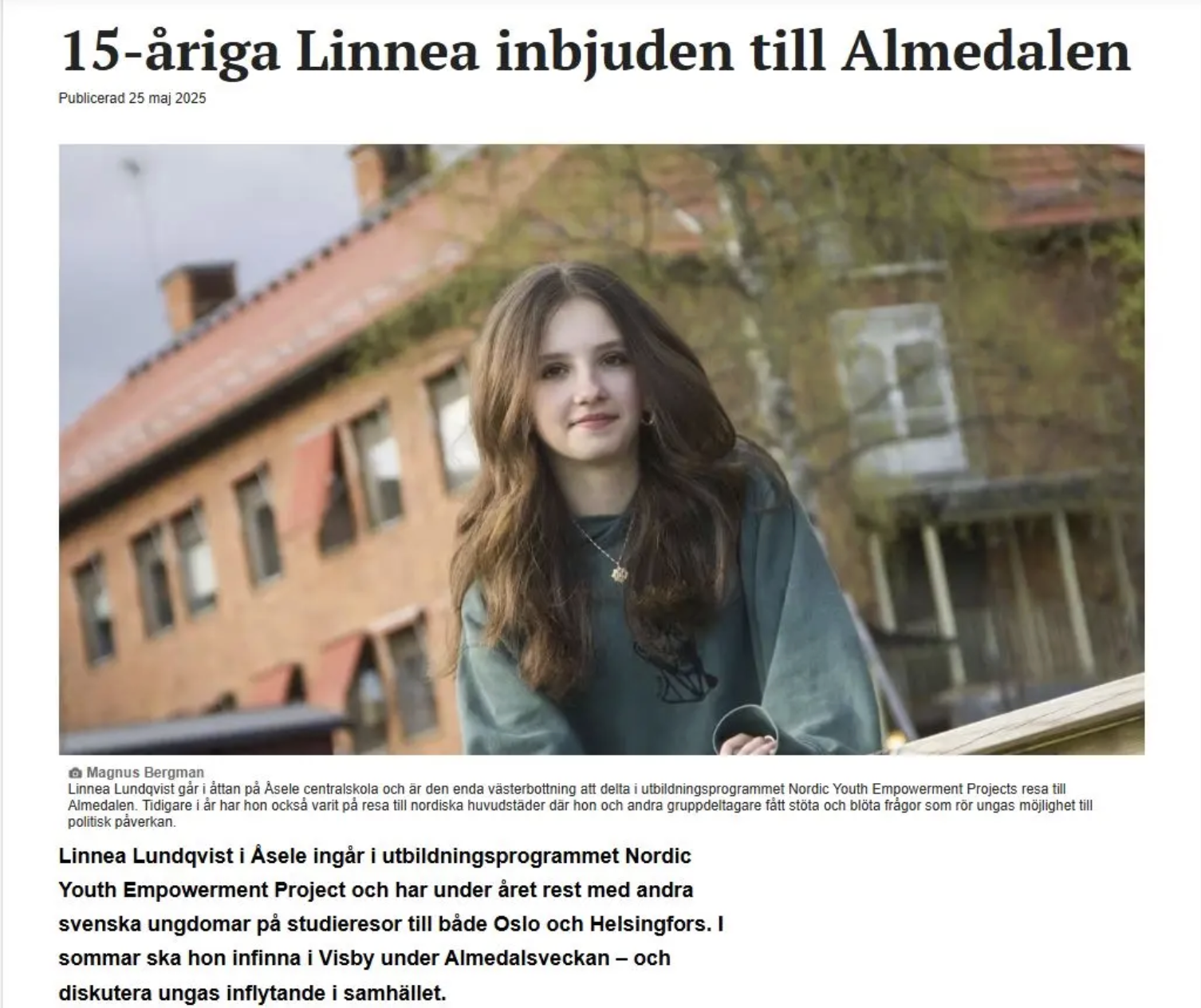 15-åriga Linnea Lundqvist från Åsele fick även möjlighet att hålla tal på Almedalsveckan i Visby när hon deltog i utbildningsprogrammet Nordic Youth Empowerment Project. Hon pratade bland annat om hur det är att vara ung i Åsele och ung i Sverige.